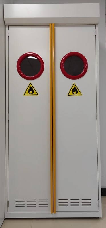 其 它:内置双不锈钢卡圈(套锁式)以固定气瓶,翻推式垫板方便气瓶推入使用,内设抽气口及补风口,便于内外界空气流通,带报警功能,整体外形美观大方
